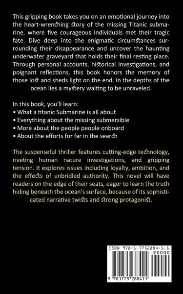 This gripping book takes you on an emotional journey into the heart-wrenching story of the missing Titanic submarine, where five courageous individuals met their tragic fate. Dive deep into the enigmatic circumstances surrounding their disappearance and uncover the haunting underwater graveyard that holds their final resting place. Through personal accounts, historical investigations, and poignant reflections, this book honors the memory of those lost and sheds light on the end. In the depths of the ocean lies a mystery waiting to be unraveled. In this book, you'll learn:What a titanic Submarine is all about Everything about the missing submersible More about the people people onboard About the efforts for far in the search The suspenseful thriller features cutting-edge technology, riveting human nature investigations, and gripping tension. It explores issues including loyalty, ambition, and the effects of unbridled authority. This novel will have readers on the edge of their seats, eager to learn the truth hiding beneath the ocean's surface, because of its sophisticated narrative twists and strong protagonist.