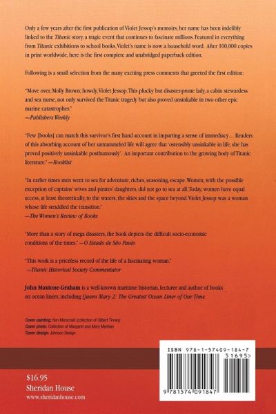 Violet Jessop's life is an inspiring story of survival. Born in 1887 in Argentina, the eldest child of Irish immigrants, at the age of 21 she became the breadwinner for her widowed mother and five siblings when she commenced a career as a stewardess and nurse on some of the most famous ocean going vessels of the day. Throughout her 40 year time at sea she survived an unbelievable series of events including the sinking of the TITANIC. "One awful moment of empty, misty blackness enveloped us in its loneliness, then an unforgettable, agonizing cry went up from 1500 despairing throats, a long wail and then silence and our tiny craft tossing about at the mercy of the ice field." For most people one sinking would be enough. But four years later Violet, now a nurse with the British Red Cross, was on board the World War I hospital ship BRITANNIC when it struck a mine and sank to the bottom of the Aegean. To her, this disaster was even more horrifying-- "Just as life seeming nothing but a whirling, choking ache, I rose to the light of day, my nose barely above the little lapping waves. I opened my eyes on an indescribable scene of slaughter, which made me shut them again to keep it out." By the end of her story we have a met a woman who could handle whatever life threw at her with determination and good humor. She knew that only by her own strength of character would she survive. But Titanic Survivor is much more. A unique autobiography for those who want to know how it really felt, a story that could be told only by a Titanic Survivor.