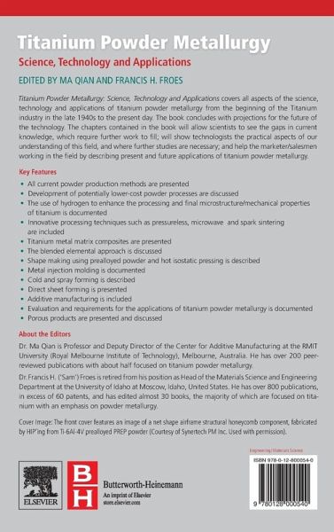 Titanium Powder Metallurgy contains the most comprehensive and authoritative information for, and understanding of, all key issues of titanium powder metallurgy (Ti PM). It summarizes the past, reviews the present and discusses the future of the science and technology of Ti PM while providing the world titanium community with a unique and comprehensive book covering all important aspects of titanium powder metallurgy, including powder production, powder processing, green shape formation, consolidation, property evaluation, current industrial applications and future developments. It documents the fundamental understanding and technological developments achieved since 1937 and demonstrates why powder metallurgy now offers a cost-effective approach to the near net or net shape fabrication of titanium, titanium alloys and titanium metal matrix composites for a wide variety of industrial applications.