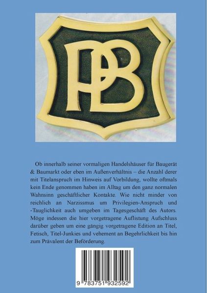 Ob innerhalb seiner vormaligen Handelshäuser für Baugerät & Baumarkt oder eben im Außenverhältnis - die Anzahl derer mit Titelanspruch im Hinweis auf Vorbildung, wollte oftmals kein Ende genommen haben im Alltag um den ganz normalen Wahnsinn geschäftlicher Kontakte. Wie nicht minder von reichlich an Narzissmus um Privilegien-Anspruch und -Tauglichkeit auch umgeben im Tagesgeschäft des Autors. Möge indessen die hier vorgetragene Auflistung Aufschluss darüber geben um eine gängig vorgetragene Edition an Titel, Fetisch, Titel-Junkies und vehement an Begehrlichkeit bis hin zum Prävalent der Beförderung.