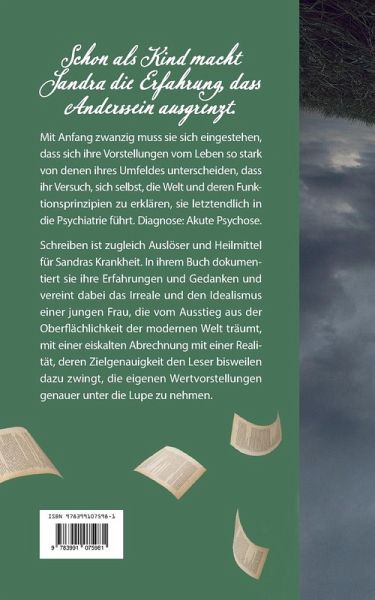 Schon als Kind macht Sandra die Erfahrung, dass Anderssein ausgrenzt. Mit Anfang zwanzig muss sie sich eingestehen, dass sich ihre Vorstellungen vom Leben so stark von denen ihres Umfeldes unterscheiden, dass ihr Versuch, sich selbst, die Welt und deren Funktionsprinzipien zu erklären, sie letztendlich in die Psychiatrie führt. Diagnose: Akute Psychose.Schreiben ist zugleich Auslöser und Heilmittel für Sandras Krankheit. In ihrem Buch dokumentiert sie ihre Erfahrungen und Gedanken und vereint dabei das Irreale und den Idealismus einer jungen Frau, die vom Ausstieg aus der Oberflächlichkeit der modernen Welt träumt, mit einer eiskalten Abrechnung mit einer Realität, deren Zielgenauigkeit den Leser bisweilen dazu zwingt, die eigenen Wertvorstellungen genauer unter die Lupe zu nehmen.