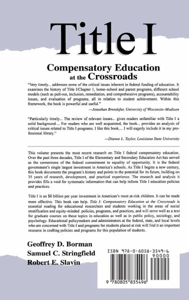 Contents: Preface. J.F. Jennings Title I: Its Legislative History and Its Promise. G.D. Borman J.V. D'Agostino Title I and Student Achievement: A Quantitative Synthesis. E.L. McDill G. Natriello History and Promise of Assessment and Accountability in Title I. G.D. Borman K.K. Wong L.V. Hedges J.V. D'Agostino Coordinating Categorical and Regular Programs: Effects on Title I Students' Educational Opportunities and Outcomes. J.V. D'Agostino L.V. Hedges K.K. Wong G.D. Borman Title I Parent-Involvement Programs: Effects on Parenting Practices and Student Achievement. H.C. Waxman Y.N. Padrón K.M. Arnold Effective Instructional Practices for Students Placed at Risk of Academic Failure. B. Rutherford Cultural and Linguistic Diversity and Title I: What Do We Know? Where Do We Go? K.K. Wong S.J. Meyer Title I Schoolwide Programs as an Alternative to Categorical Practices: An Organizational Analysis of Surveys From the Prospects Study. R.E. Slavin How Title I Can Become the Engine of Reform in America's Schools.
