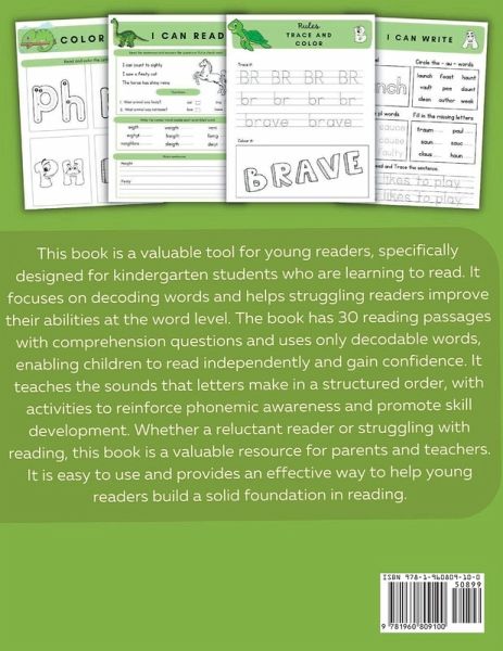 This book is a set of 30 reading passages with comprehension questions appropriate for kindergarten students, focusing only on decodable words and teaching struggling readers at the word level, including all decodable texts that focus on phonics skills. In these phases, 1, 2, 3, children will learn the sounds that letters make (phonemes). There are 30 sounds in all, 15 of which are made with one letter, and the 15 most common two-letter sounds. Although the order in which sounds are taught will depend on which scheme your child's school follows, this book begins with a specific order. It starts with the most commonly used phonemes and progresses to more complex ones, including letters with similar sounds and letters that look similar, like/b/d/p/q/u/v/w/f/t/m/n/br/pl/dr/ph/sp/sc, and so on. This book includes: Each phoneme letter has six steps (six pages) in activity packets for struggling readers, including the Orton Gillingham approach. Text-Based Questions - Students will refer back to the text to answer three questions per story and write the sight words found in the same story. Sight Words - All passages include common kindergarten and first-grade sight words. Skill Application - Each passage includes skill activities such as: Writing sight words found in the story Reading and tracing the letter Finding the correct words Circle the sound Filling in the missing letters Making sentences Coloring phoneme letters, and more! Whether your child is a reluctant reader or struggling with reading, this book is a valuable resource for parents and teachers. It is convenient, easy to use, and provides an effective way to help young readers build a solid foundation in reading. With the help of this book, your child will be on their way to becoming a confident and proficient reader in no time.