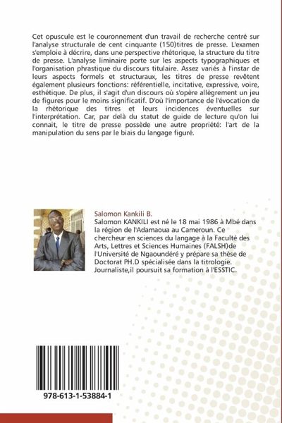 Cet opuscule est le couronnement d'un travail de recherche centré sur l'analyse structurale de cent cinquante (150)titres de presse. L'examen s'emploie à décrire, dans une perspective rhétorique, la structure du titre de presse. L'analyse liminaire porte sur les aspects typographiques et l'organisation phrastique du discours titulaire. Assez variés à l'instar de leurs aspects formels et structuraux, les titres de presse revêtent également plusieurs fonctions: référentielle, incitative, expressive, voire, esthétique. De plus, il s'agit d'un discours où s'opère allègrement un jeu de figures pour le moins significatif. D'où l'importance de l'évocation de la rhétorique des titres et leurs incidences éventuelles sur l'interprétation. Car, par delà du statut de guide de lecture qu'on lui connait, le titre de presse possède une autre propriété: l'art de la manipulation du sens par le biais du langage figuré.