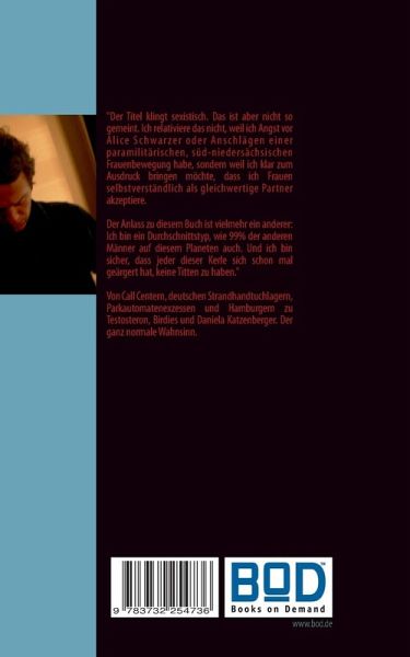"Der Titel klingt sexistisch. Das ist aber nicht so gemeint. Ich relativiere das nicht, weil ich Angst vor Alice Schwarzer oder Anschlägen einer paramilitärischen, süd-niedersächsischen Frauenbewegung habe, sondern weil ich klar zum Ausdruck bringen möchte, dass ich Frauen selbstverständlich als gleichwertige Partner akzeptiere.Der Anlass zu diesem Buch ist vielmehr ein anderer: Ich bin ein Durchschnittstyp, wie 99% der anderen Männer auf diesem Planeten auch. Und ich bin sicher, dass jeder dieser Kerle sich schon mal geärgert hat, keine Titten zu haben."Von Call Centern, deutschen Strandhandtuchlagern, Parkautomatenexzessen und Hamburgern zu Testosteron, Birdies und Daniela Katzenberger. Der ganz normale Wahnsinn."