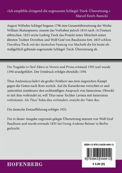 William Shakespeare: Titus Andronicus (Titus Andronicus) Die Tragödie in fünf Akten in Versen und Prosa entstand 1593 und wurde 1594 uraufgeführt. Der Erstdruck erfolgte ebenfalls 1594. Titus Andronicus kehrt als großer Feldherr aus dem siegreichen Kampf gegen die Goten nach Rom zurück. Auf die Kaiserkrone verzichtet er und unterstützt stattdessen den rechtmäßigen Anspruch von Saturninus. Obwohl er mit ihm verfeindet ist, will Titus seine Tochter Lavinia mit Saturninus verheiraten. Als Titus¿ Sohn dies verhindert, ersticht der Vater ihn. Die deutsche Erstaufführung erfolgte 1925. Die in dieser Ausgabe zugrunde gelegte Übersetzung stammt von Wolf Graf Baudissin und wurde erstmals 1831 bei Georg Andreas Reimer in Berlin gedruckt. Zur Schlegel-Tieck-Übersetzung: August Wilhelm Schlegel begann 1796 eine Gesamtübersetzung der Werke William Shakespeares, musste das Vorhaben jedoch 1810 nach 14 Dramen abbrechen. 1825 setzte Ludwig Tieck das Projekt unter Mitarbeit seiner ältesten Tochter Dorothea und Wolf Graf von Baudissins fort. 1833 schloss Dorothea Tieck mit der deutschen Fassung von Macbeth die bis heute als maßgeblich geltende sogenannte Schlegel-Tieck-Übersetzung ab. »Ich empfehle dringend die sogenannte Schlegel-Tieck-Übersetzung.« Marcel Reich-Ranicki Erstmals ins Deutsche übersetzt von Johann Joachim Eschenburg (1777). Die vorliegende Übersetzung stammt von Wolf Graf Baudissin. Erstdruck in: Shakspeare's dramatische Werke. Übersetzt von August Wilhelm Schlegel. Ergänzt und erläutert von Ludwig Tieck, Bd. 6, Berlin (Georg Andreas Reimer) 1831. Vollständige Neuausgabe. Herausgegeben von Karl-Maria Guth. Berlin 2015. Textgrundlage ist die Ausgabe: William Shakespeare: Sämtliche Werke in vier Bänden. Band 4, Herausgegeben von Anselm Schlösser. Berlin: Aufbau, 1975. Die Paginierung obiger Ausgabe wird in dieser Neuausgabe als Marginalie zeilengenau mitgeführt. Umschlaggestaltung von Thomas Schultz-Overhage unter Verwendung des Bildes: Willi, Tim Tempelhofer, 2015. Gesetzt aus Minion Pro, 11 pt.