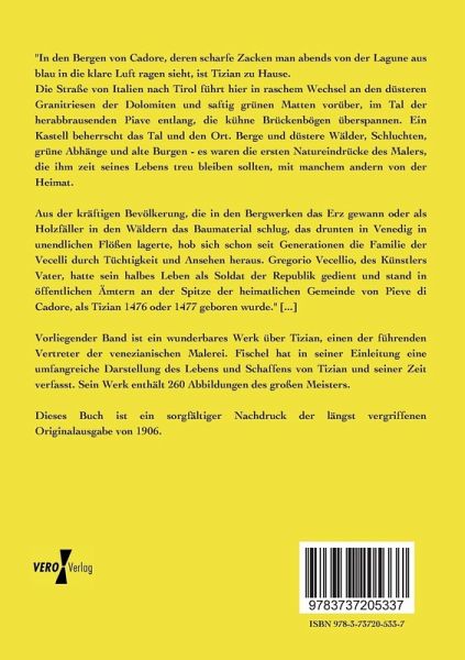 Vorliegender Band ist ein wunderbares Werk über Tizian, einen der führenden Vertreter der venezianischen Malerei. Fischel hat in seiner Einleitung eine umfangreiche Darstellung des Lebens und Schaffens von Tizian und seiner Zeit verfasst. Sein Werk enthält 260 Abbildungen des großen Meisters.