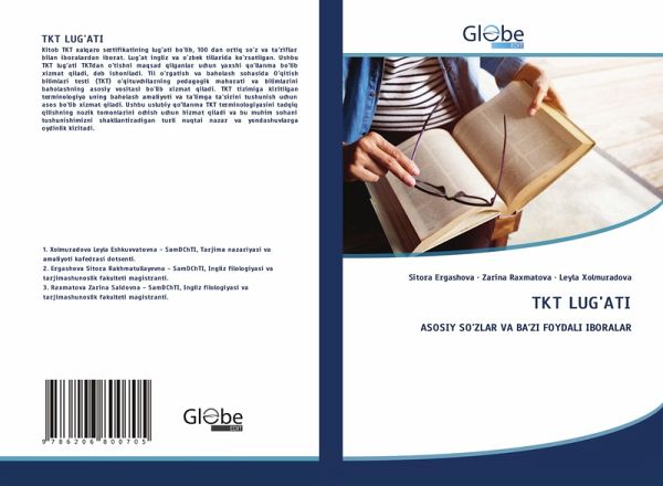 Kitob TKT xalqaro sertifikatining lug'ati bo'lib, 100 dan ortiq so'z va ta'riflar bilan iboralardan iborat. Lug'at ingliz va o'zbek tillarida ko'rsatilgan. Ushbu TKT lug'ati TKTdan o'tishni maqsad qilganlar uchun yaxshi qo'llanma bo'lib xizmat qiladi, deb ishoniladi. Til o'rgatish va baholash sohasida O'qitish bilimlari testi (TKT) o'qituvchilarning pedagogik mahorati va bilimlarini baholashning asosiy vositasi bo'lib xizmat qiladi. TKT tizimiga kiritilgan terminologiya uning baholash amaliyoti va ta'limga ta'sirini tushunish uchun asos bo'lib xizmat qiladi. Ushbu uslubiy qo'llanma TKT terminologiyasini tadqiq qilishning nozik tomonlarini ochish uchun hizmat qiladi va bu muhim sohani tushunishimizni shakllantiradigan turli nuqtai nazar va yondashuvlarga oydinlik kiritadi.