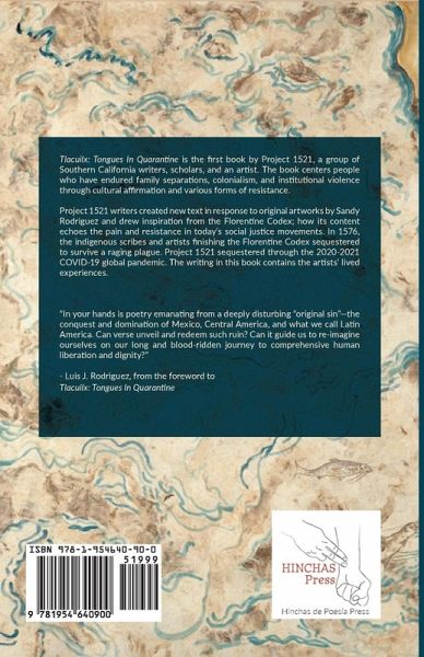 Tlacuilix: Tongues In Quarantine is the first book by Project 1521, a group of Southern California writers, scholars, and an artist. The collection of poetry and prose centers the experience of people who have endured family separations, colonialism, and institutional violence and have responded through cultural affirmation and various forms of resistance. It features the related paintings of Sandy Rodriguez. Project 1521 writers created new text in response to original artworks by Sandy Rodriguez and drew inspiration in the Florentine Codex; studied and wrote about how the content echoed the pain and resistance in today's social justice movements. The Codex is a monumental history of the Indigenous people of central Mexico made in the aftermath of the Spanish conquest of the Aztecs in 1521. In 1576, the Indigenous scribes and artists finishing the Codex sequestered to survive a raging plague. Project 1521 sequestered through the 2020-2021 COVID-19 global pandemic and wrote about Central American migrants, immigration, genocide, police brutality, and the remnants of colonialism in Latin America and beyond.