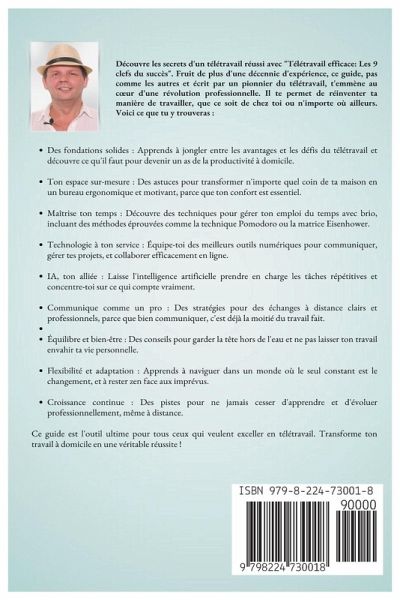 Découvre les secrets d'un télétravail réussi avec "Télétravail efficace: Les 9 clefs du succès". Fruit de plus d'une décennie d'expérience, ce guide, pas comme les autres et écrit par un pionnier du télétravail, t'emmène au c¿ur d'une révolution professionnelle. Il te permet de réinventer ta manière de travailler, que ce soit de chez toi ou n'importe où ailleurs. Voici ce que tu y trouveras :Des fondations solides : Apprends à jongler entre les avantages et les défis du télétravail et découvre ce qu'il faut pour devenir un as de la productivité à domicile. Ton espace sur-mesure : Des astuces pour transformer n'importe quel coin de ta maison en un bureau ergonomique et motivant, parce que ton confort est essentiel. Maîtrise ton temps : Découvre des techniques pour gérer ton emploi du temps avec brio, incluant des méthodes éprouvées comme la technique Pomodoro ou la matrice Eisenhower. Technologie à ton service : Équipe-toi des meilleurs outils numériques pour communiquer, gérer tes projets, et collaborer efficacement en ligne. L'IA, ton alliée : Laisse l'intelligence artificielle prendre en charge les tâches répétitives et concentre-toi sur ce qui compte vraiment. Communique comme un pro : Des stratégies pour des échanges à distance clairs et professionnels, parce que bien communiquer, c'est déjà la moitié du travail fait. Équilibre et bien-être : Des conseils pour garder la tête hors de l'eau et ne pas laisser ton travail envahir ta vie personnelle. Flexibilité et adaptation : Apprends à naviguer dans un monde où le seul constant est le changement, et à rester zen face aux imprévus. Croissance continue : Des pistes pour ne jamais cesser d'apprendre et d'évoluer professionnellement, même à distance. Ce guide est l'outil ultime pour tous ceux qui veulent exceller en télétravail. Mets la main sur "Télétravail efficace: Les 9 clefs du succès" et transforme ton travail à domicile en une véritable réussite !
