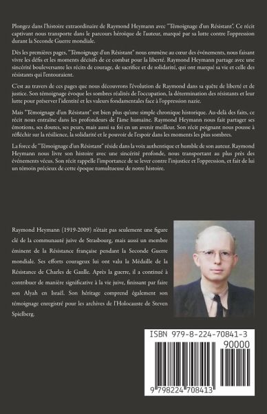 Plongez dans l'histoire extraordinaire de Raymond Heymann avec "Témoignage d'un Résistant". Ce récit captivant nous transporte dans le parcours héroïque de l'auteur, marqué par sa lutte contre l'oppression durant la Seconde Guerre mondiale. Dès les premières pages, "Témoignage d'un Résistant" nous emmène au c¿ur des événements, nous faisant vivre les défis et les moments décisifs de ce combat pour la liberté. Raymond Heymann partage avec une sincérité bouleversante les récits de courage, de sacrifice et de solidarité, qui ont marqué sa vie et celle des résistants qui l'entouraient. C'est au travers de ces pages que nous découvrons l'évolution de Raymond dans sa quête de liberté et de justice. Son témoignage évoque les sombres réalités de l'occupation, la détermination des résistants et leur lutte pour préserver l'identité et les valeurs fondamentales face à l'oppression nazie. Mais "Témoignage d'un Résistant" est bien plus qu'une simple chronique historique. Au-delà des faits, ce récit nous entraîne dans les profondeurs de l'âme humaine. Raymond Heymann nous fait partager ses émotions, ses doutes, ses peurs, mais aussi sa foi en un avenir meilleur. Son récit poignant nous pousse à réfléchir sur la résilience, la solidarité et le pouvoir de l'espoir dans les moments les plus sombres. La force de "Témoignage d'un Résistant" réside dans la voix authentique et humble de son auteur. Raymond Heymann nous livre son histoire avec une sincérité profonde, nous transportant au plus près des événements vécus. Son récit rappelle l'importance de se lever contre l'injustice et l'oppression, et fait de lui un témoin précieux de cette époque tumultueuse de notre histoire. Ce livre offre aux lecteurs une expérience unique et captivante. Au fil des pages, on ressent l'urgence et la nécessité de la résistance, ainsi que l'espoir qui émerge de l'adversité. "Témoignage d'un Résistant" est un appel à l'action, à ne jamais oublier les leçons du passé et à continuer à défendre nos valeurs communes. Plongez dans ce récit poignant, laissez-vous emporter par les mots de Raymond Heymann et rejoignez cette communauté de résistants qui ont marqué l'histoire de notre pays. "Témoignage d'un Résistant" est un livre que vous ne pourrez pas lâcher, une histoire qui vous hantera longtemps après avoir tourné la dernière page. Préparez-vous à être inspiré, ému et à ressentir la puissance du courage humain face à l'adversité. Lisez "Témoignage d'un Résistant" dès maintenant et témoignez de l'héritage inestimable des résistants qui ont façonné notre histoire.