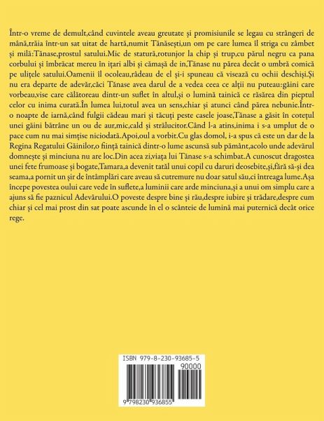 Într-o vreme de demult,când cuvintele aveau greutate ¿i promisiunile se legau cu strângeri de mân¿,tr¿ia într-un sat uitat de hart¿,numit T¿n¿se¿ti,un om pe care lumea îl striga cu zâmbet ¿i mil¿:T¿nase,prostul satului.Mic de statur¿,rotunjor la chip ¿i trup,cu p¿rul negru ca pana corbului ¿i îmbr¿cat mereu în i¿ari albi ¿i c¿mä¿ de in,T¿nase nu p¿rea decât o umbr¿ comic¿ pe uli¿ele satului.Oamenii îl ocoleau,râdeau de el ¿i-i spuneau c¿ viseaz¿ cu ochii deschi¿i.¿i nu era departe de adev¿r,c¿ci T¿nase avea darul de a vedea ceea ce al¿ii nu puteau:g¿ini care vorbeau,vise care c¿l¿toreau dintr-un suflet în altul,¿i o lumin¿ tainic¿ ce r¿s¿rea din pieptul celor cu inima curat¿.În lumea lui,totul avea un sens,chiar ¿i atunci când p¿rea nebunie.Într-o noapte de iarn¿,când fulgii c¿deau mari ¿i t¿cu¿i peste casele joase,T¿nase a g¿sit în cote¿ul unei g¿ini b¿trâne un ou de aur,mic,cald ¿i str¿lucitor.Când l-a atins,inima i s-a umplut de o pace cum nu mai sim¿ise niciodat¿.Apoi,oul a vorbit.Cu glas domol,i-a spus c¿ este un dar de la Regina Regatului G¿inilor,o fiin¿¿ tainic¿ dintr-o lume ascuns¿ sub p¿mânt,acolo unde adev¿rul domne¿te ¿i minciuna nu are loc.Din acea zi,viäa lui T¿nase s-a schimbat.A cunoscut dragostea unei fete frumoase ¿i bogate,Tamara,a devenit tat¿l unui copil cu daruri deosebite,¿i,f¿r¿ s¿-¿i dea seama,a pornit un ¿ir de întâmpl¿ri care aveau s¿ cutremure nu doar satul s¿u,ci întreaga lume.A¿a începe povestea oului care vede în suflete,a luminii care arde minciuna,¿i a unui om simplu care a ajuns s¿ fie paznicul Adev¿rului.O poveste despre bine ¿i r¿u,despre iubire ¿i tr¿dare,despre cum chiar ¿i cel mai prost din sat poate ascunde în el o scânteie de lumin¿ mai puternic¿ decât orice rege.