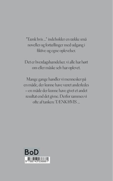 "Tænk hvis ..." indeholder en række små noveller og fortællinger med udgang i fiktive og egne oplevelser. Det er hverdagshændelser, vi alle har hørt om eller måske selv har oplevet. Mange gange handler vi mennesker på en måde, der kunne have været anderledes - en måde der kunne have givet et andet resultat end det givne. Derfor rammes vi ofte af tanken: TÆNK HVIS ...