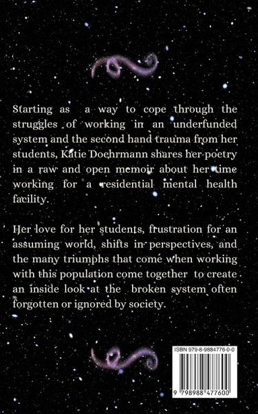 Starting as a way to cope through the struggles of working in an underfunded system and the second hand system from her students, Katie Doehrmann shares her poetry in a raw and open memoir about her time working for a residential mental health facility. Her love for her students, frustration for an assuming world, shifts in perspectives, and the many triumphs that come when working with this population come together to create an inside look at a side of the broken system often forgotten or ignored by society.