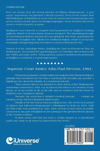 Few are aware that the actual identity of William Shakespeare, a pen name, represents our greatest cultural mystery. Even fewer realize that Will Shakspere of Stratford-on-Avon was an uneducated businessman who never owned a book, knew no foreign languages, never traveled and never wrote a word of poetry or prose. Shakspere was a front for a complete fraud perpetrated by England¿s leading politician, Robert Cecil, for reasons of power and greed. The astonishing strength of Conventional Wisdom has kept the ruse going for 400 years, perpetrated by professors of English who, blinded by traditional dogma, refuse to accept the remarkable and growing body of evidence in favor of Edward de Vere. Volume 8 of the Anthology Series, Building the Case for Edward de Vere As Shakespeare, documents the quickening pace of Oxfordian discoveries in the late 1990s and early 2000s. These present massive problems for professors of English to combat in a convincing manner. Supreme Court Justice John Paul Stevens, 1991: ¿For present purposes, I shall confine my analysis to the Sherlock Holmes principle that sometimes the fact that a watchdog did not bark may provide a significant clue about the identity of a murderous intruder. ¿This concern directs our attention to three items of [the Shakespeare authorship controversy]. First, it is of interest that there is no mention of any library, or of any books at all, in his will, and no evidence that his house in Stratford ever contained a library. ¿Second, his son-in-law¿s detailed medical journals . . . contain no mention of the doctor¿s illustrious father-in-law. ¿Finally is the fact that is most puzzling to me¿the seven-year period of silence that followed Shakespeare¿s [Shakspere¿s] death in 1616. Until the First Folio was published in 1623, there seems to have been no public comment in any part of England on the passing of the greatest literary genius in the country¿s history. ¿It does seem odd that not even a cocker spaniel or a dachshund made any noise at all when he passed from the scene.¿