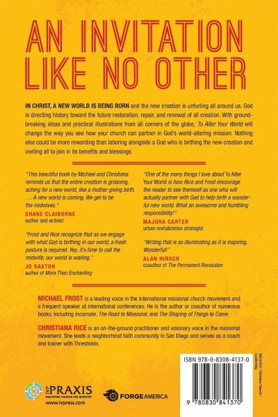 15th Annual Outreach Magazine Resource of the Year - Also Recommended in Church In Christ, a new world is being born and the new creation is unfurling all around us. God is directing history toward the future restoration, repair, and renewal of all creation. And our job is to cooperate with God in being a sign and foretaste of that coming world. Renowned missional leaders Michael Frost and Christiana Rice introduce the bold metaphor of a midwife to depict us as God's birthing attendants as the kingdom comes on earth as it is in heaven. With groundbreaking ideas and practical illustrations from all corners of the globe, To Alter Your World will change the way you see how your church can partner in God's world-altering mission. Nothing else could be more rewarding than laboring alongside a God who is birthing the new creation and inviting all to join in its benefits and blessings.Hinweis: Dieser Artikel kann nur an eine deutsche Lieferadresse ausgeliefert werden.