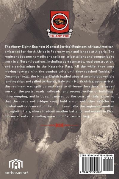 The Ninety-Eighth Engineer (General Service) Regiment, African American, embarked for North Africa in February 1943 and landed at Algeria. The regiment became nomadic and split up its battalions and companies to work in different locations, including port stewards, road construction, and clearing mines in the Kasserine Pass. All the while, they were moving forward with the combat units until they reached Tunisia. In December 1943, the Ninety-Eighth loaded aboard amphibious vehicle landing ships and sailed to Naples, Italy. As in North Africa, upon arrival, the regiment was split up and sent to different locations. It began work on the ports, roads, railroads, and reconstruction of buildings, minesweeping, and bridges. It moved up the coast of Italy, ensuring that the roads and bridges could hold armor and other vehicles as combat units advanced up the boot. Eventually, the regiment reunited in Leghorn, Italy, where it added another battalion and worked in Pisa, Florence, and surrounding areas until September 1945.