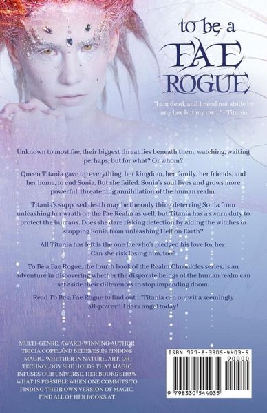 "I am dead, and I need not abide by any law but my own." - Titania Unknown to most fae, their biggest threat lies beneath them, watching, waiting perhaps, but for what? Or whom? Queen Titania gave up everything, her kingdom, her family, her friends, and her home, to end Sonia. Alas, Sonia's soul lives and grows more powerful, threatening annihilation of the human realm. Titania's supposed death may be the only thing deterring Sonia from unleashing her wrath on the Fae Realm as well, but Titania has a sworn duty to protect the humans. Does she dare risking detection by aiding the witches in stopping Sonia from unleashing Hell on Earth? All Titania has left is the one fae who's pledged his love for her. Can she risk losing him, too? To Be a Fae Rogue, the fourth book of the Realm Chronicles series, is an adventure in discovering whether the disparate beings of the human realm can set aside their differences to stop impending doom. Read To Be a Fae Rogue to find out if Titania can outwit a powerful dark angel today!
