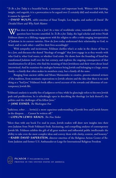 A New York Times Bestseller A leading public intellectual's timely reckoning with how Jews can and should make sense of their tradition and each other. What does it mean to be a Jew? At a time of worldwide crisis, venerable answers to this question have become unsettled. In To Be a Jew Today, the legal scholar and columnist Noah Feldman draws on a lifelong engagement with his religion to offer a wide-ranging interpretation of Judaism in its current varieties. How do Jews today understand their relationship to God, to Israel, and to each other-and live their lives accordingly? Writing sympathetically but incisively about diverse outlooks, Feldman clarifies what's at stake in the choice of how to be a Jew, and discusses the shared "theology of struggle" that Jews engage in as they wrestle with who God is, what God wants, or whether God exists. He shows how the founding of Israel has transformed Judaism itself over the last century-and explores the ongoing consequences of that transformation for all Jews, who find the meaning of their Jewishness and their views about Israel intertwined, no matter what those views are. And he examines the analogies between being Jewish and belonging to a large, messy family-a family that often makes its members crazy, but a family all the same. Written with learning, empathy and clarity, To Be a Jew Today is a critical resource for readers of all faiths.