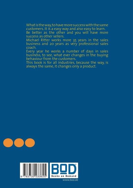 What is the way, to have more success with the same customers. It is a easy way and also easy to learn.Be better as the other and you will have more success as other sellers.Michael Ritter works more 35 years in the sales business and 20 years as very professional sales coach.Every year he works a number of days in sales business, to see, what ever changes in the buying behaviour from the customers.This book is for all industries, because the way, is always the same, it changes only a product.