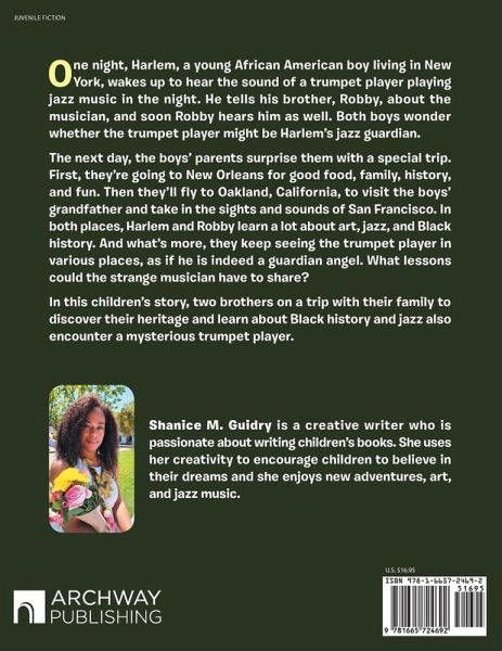One night, Harlem, a young African American boy living in New York, wakes up to hear the sound of a trumpet player playing jazz music in the night. He tells his brother, Robby, about the musician, and soon Robby hears him as well. Both boys wonder whether the trumpet player might be Harlem's jazz guardian. The next day, the boys' parents surprise them with a special trip. First, they're going to New Orleans for good food, family, history, and fun. Then they'll fly to Oakland, California, to visit the boys' grandfather and take in the sights and sounds of San Francisco. In both places, Harlem and Robby learn a lot about art, jazz, and Black history. And what's more, they keep seeing the trumpet player in various places, as if he is indeed a guardian angel. What lessons could the strange musician have to share? In this children's story, two brothers on a trip with their family to discover their heritage and learn about Black history and jazz also encounter a mysterious trumpet player.