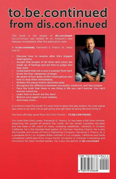 This book is the sequel of dis.con.tinued. Dis.con.tinued was ranked #1 on Amazon's new releases immediately after the publication date. In to.be.continued, Fernando E. Franco Sr., helps you to: Discover how to resume after life's biggest interruptions. Accept that people of all races and colors are made up of feelings and are free to judge who they want. Understand that not a soul is exempt from hurt. Know the four categories of anger. Be aware of four areas of life's interruptions and how to stop them immediately. Release the pause button and press play. Recognize the difference between successful, mediocre, and lazy people. Face the truth that there is one thing in life you can't borrow. You can't borrow tomorrow. Learn how to knock out the devil. Believe once again in your dreams. And many more... It is time to read this book! It's your time to press the play button, for your pause has come to an end! Let us get going and get back at doing life and loving it. We have officially gone from DIS.CON.TINUED - TO.BE.CONTINUED.