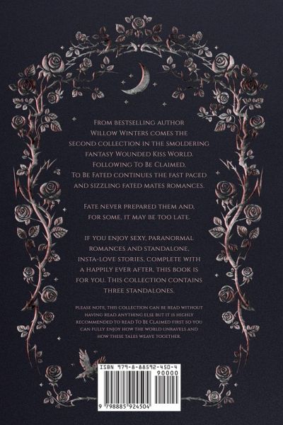 From best selling author Willow Winters comes the second collection in the smoldering fantasy Wounded Kiss World. Following To Be Claimed, To Be Fated continues the fast paced and sizzling fated mates romances. Fate never prepared them and, for some, it may be too late. If you enjoy sexy, paranormal romances and stand-alone, insta-love stories, complete with a happily ever after, this book is for you. This collection contains three standalones. Please note, this collection can be read without having read anything else but it is highly recommended to read To Be Claimed first so you can fully enjoy how the world unravels and how these tales weave together.
