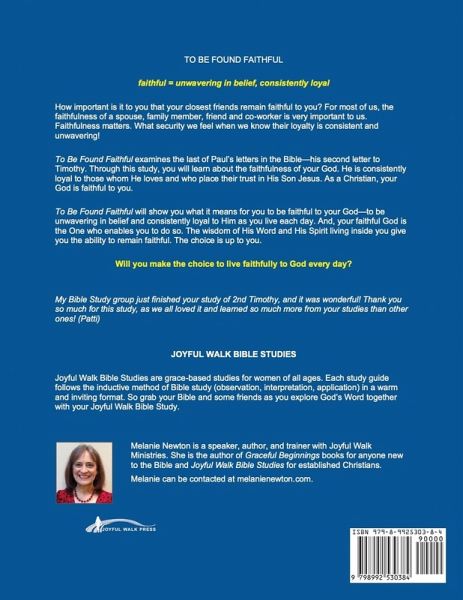 To Be Found Faithful examines the last of Paul's letters in the Bible-his second letter to Timothy. It is an 8-lesson study with matching podcasts that will help you stay faithful. Our God is a faithful God-consistently loyal to those whom He loves and who place their trust in Him. And God desires that we also be faithful to Him-to be unwavering in belief and consistently loyal to Him as we grow older. In this study, you will discover what faithfulness is and how to stay faithful to God's truth, to God's ways, and to God's people for your whole lifetime, even when you grow old. How important is it that your loved ones remain faithful to you? Do you believe that faithfulness matters? To Be Found Faithful will show you what it means for you to be faithful to your God-to be unwavering in belief and consistently loyal to Him as you live each day. And your faithful God is the One who enables you to do so. The wisdom of His Word and His Spirit living inside you give you the ability to remain faithful. The choice is up to you. Will you make the choice to live faithfully to your God every day? The To Be Found Faithful study of 2nd Timothy will lead you to make that choice.