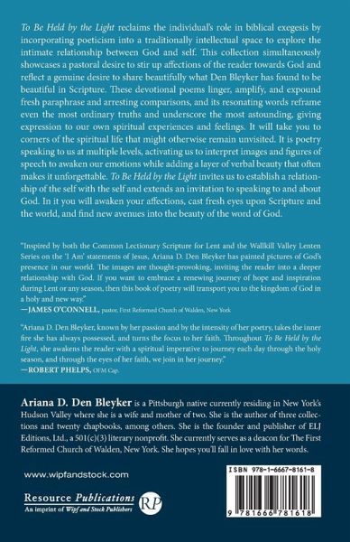 To Be Held by the Light reclaims the individual's role in biblical exegesis by incorporating poeticism into a traditionally intellectual space to explore the intimate relationship between God and self. This collection simultaneously showcases a pastoral desire to stir up affections of the reader towards God and reflect a genuine desire to share beautifully what Den Bleyker has found to be beautiful in Scripture. These devotional poems linger, amplify, and expound fresh paraphrase and arresting comparisons, and its resonating words reframe even the most ordinary truths and underscore the most astounding, giving expression to our own spiritual experiences and feelings. It will take you to corners of the spiritual life that might otherwise remain unvisited. It is poetry speaking to us at multiple levels, activating us to interpret images and figures of speech to awaken our emotions while adding a layer of verbal beauty that often makes it unforgettable. To Be Held by the Light invites us to establish a relationship of the self with the self and extends an invitation to speaking to and about God. In it you will awaken your affections, cast fresh eyes upon Scripture and the world, and find new avenues into the beauty of the word of God.
