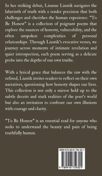 In her striking debut, Lisanne Liustik navigates the labyrinth of truth with a tender precision that both challenges and cherishes the human experience. "To Be Honest" is a collection of poignant poems that explore the nuances of honesty, vulnerability, and the often unspoken complexities of personal relationships. Through Liustik's evocative verses, we journey across moments of intimate revelation and quiet introspection, each poem serving as a delicate probe into the depths of our own truths. With a lyrical grace that balances the raw with the refined, Liustik invites readers to reflect on their own narratives, questioning how honesty shapes our lives. This collection is not only a mirror held up to the subtle deceits and stark realities of the poet's world but also an invitation to confront our own illusions with courage and clarity. "To Be Honest" is an essential read for anyone who seeks to understand the beauty and pain of being truthfully human. Copyright © 2024 Book Fairy Publishing