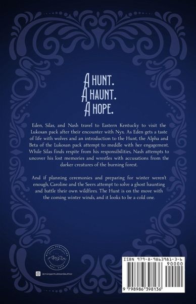 A hunt. A haunt. A hope. Eden, Silas, and Nash travel to Eastern Kentucky to visit the Lukosan pack after their encounter with Nyx. As Eden gets a taste of life with wolves and an introduction to the Hunt, the Alpha and Beta of the Lukosan pack attempt to meddle with her engagement. While Silas finds respite from his responsibilities, Nash attempts to uncover his lost memories and wrestles with accusations from the darker creatures of the burning forest. And if planning ceremonies and preparing for winter weren't enough, Caroline and the Seers attempt to solve a ghost haunting and battle their own wildfires. The Hunt is on the move with the coming winter winds, and it looks to be a cold one.