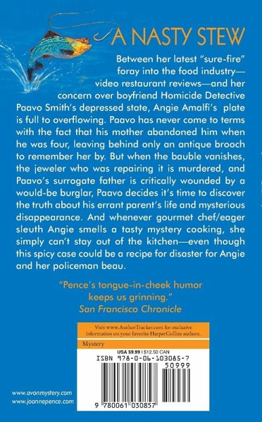 A Nasty Stew Between her latest "sure?fire" foray into the food industry?video restaurant reviews?and her concern over boyfriend Homicide Detective Paavo Smith's depressed state, Angie Amalfi's plate is full to overflowing. Paavo has never come to terms with the fact that his mother abandoned him when he was four, leaving vehind only an antique brooch to remember her by. But when the bauble vanishes, the jeweler who was repairing it is murdered, and Paavo's surrogate father is critically wounded by a would?be burglar, Paavo decides it's time to discover the truth about his errant parent's life and mysterious disappearance. Gourmet chef and eager sleuth Angie Smells a tasty mystery cooking. But what's bubbling in this pot is a lethal goulash of intrigues, betrayals, FBI deceptions, and murderous Russian mafia mayhem?an old family recipe for disaster for Angie and her policeman beau.