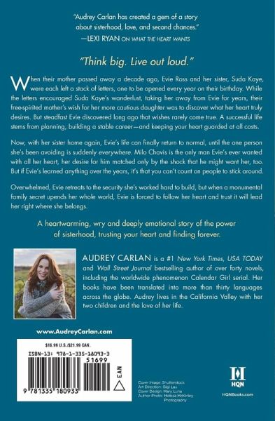 Audrey Carlan has created a gem of a story about sisterhood, love, and second chances." -Lexi Ryan on What the Heart Wants A heartwarming, wry and deeply emotional story of the power of sisterhood, trusting your heart and finding forever. "Think big. Live out loud." When their mother passed away a decade ago, Evie Ross and her sister, Suda Kaye, were each left a stack of letters, one to be opened every year on their birthday. While the letters encouraged Suda Kaye's wanderlust, taking her away from Evie for years, their free-spirited mother's wish for her more cautious daughter was to discover what her heart truly desires. But steadfast Evie discovered long ago that wishes rarely come true. A successful life stems from planning, building a stable career-and keeping your heart guarded at all costs. Now, with her sister home again, Evie's life can finally return to normal, until the one person she's been avoiding is suddenly everywhere. Milo Chavis is the only man Evie's ever wanted with all her heart, her desire for him matched only by the shock that he might want her, too. But if Evie's learned anything over the years, it's that you can't count on people to stick around. Overwhelmed, Evie retreats to the security she's worked hard to build, but when a monumental family secret upends her whole world, Evie is forced to follow her heart and trust it will lead her right where she belongs. Don't miss On the Sweet Side,the next book in Audrey Carlan's The Wish series! With the emotional pull of Susan Wiggs' and Robyn Carr's engaging family dramas, On the Sweet Side is a sassy and emotional strangers-to-sisters story about the enduring power of family-both the one you're born with and the one you choose. The Wish Series Book 1: What the Heart Wants Book 2: To Catch a Dream Book 3: On the Sweet Side