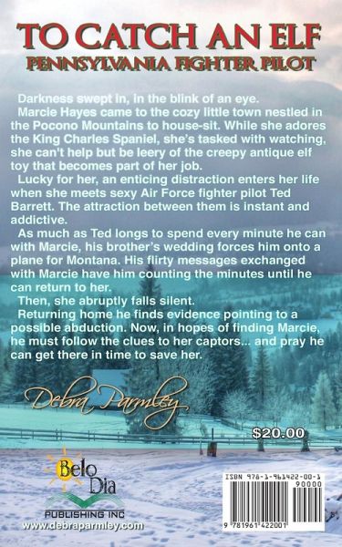 Darkness swept in, in the blink of an eye. Marcie Hayes came to the cozy little town nestled in the Pocono Mountains to house-sit. While she adores the King Charles Spaniel, she's tasked with watching, she can't help but be leery of the creepy antique elf toy that becomes part of her job. Lucky for her, an enticing distraction enters her life when she meets sexy Air Force fighter pilot Ted Barrett. The attraction between them is instant and addictive. As much as Ted longs to spend every minute he can with Marcie, his brother's wedding forces him onto a plane for Montana. His flirty messages exchanged with Marcie have him counting the minutes until he can return to her. Then, she abruptly falls silent. Returning home he finds evidence pointing to a possible abduction. Now, in hopes of finding Marcie, he must follow the clues to her captors... and pray he can get there in time to save her.