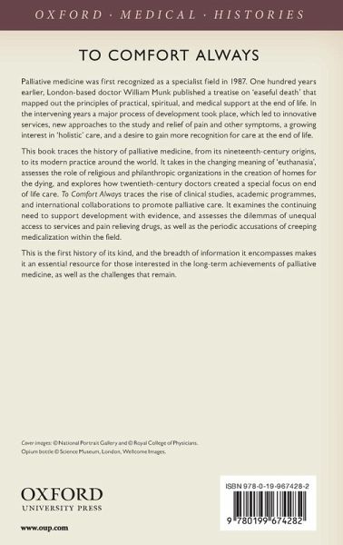 Palliative medicine was first recognised as a specialist field in 1987. One hundred years earlier, London based doctor William Munk published a treatise on 'easeful death' that mapped out the principles of practical, spiritual, and medical support at the end of life. In the intervening years a major process of development took place which led to innovative services, new approaches to the study and relief of pain and other symptoms, a growing interest in 'holistic' care, and a desire to gain more recognition for care at the end of life. This book traces the history of palliative medicine, from its nineteenth-century origins, to its modern practice around the world. It takes in the changing meaning of 'euthanasia', assesses the role of religious and philanthropic organisations in the creation of homes for the dying, and explores how twentieth-century doctors created a special focus on end of life care. To Comfort Always traces the rise of clinical studies, academic programmes and international collaborations to promote palliative care. It examines the continuing need to support development with evidence, and assesses the dilemmas of unequal access to services and pain relieving drugs, as well as the periodic accusations of creeping medicalization within the field. This is the first history of its kind, and the breadth of information it encompasses makes it an essential resource for those interested in the long-term achievements of palliative medicine as well as the challenges that remain.