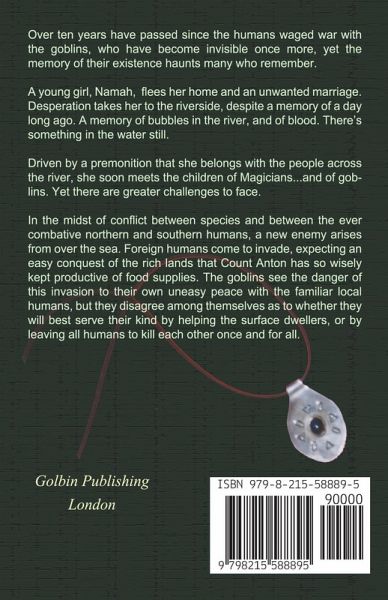 A young girl, Namah, flees her home and an unwanted marriage. Desperation takes her to the riverside, the site where as a toddler she was patted kindly by the goblin who had befriended Count Anton. But another memory of that day unsettles her as she pushes the small boat into the current. A memory of bubbles in the river, and of blood. There's something in the water still. Driven by a premonition that she belongs with the people across the river, she soon meets the children of Magicians...and of goblins. Yet there are greater challenges to face. In the midst of conflict between species, between generations, and between the ever combative northern and southern humans, a new enemy arises from over the sea. Foreign humans come to invade, expecting an easy conquest of the rich lands that Count Anton has so wisely kept productive of food supplies. The goblins see the danger of this invasion to their own uneasy peace with the familiar local humans, but they disagree among themselves as to whether they will best serve their kind by helping the surface dwellers, or by leaving all humans to kill each other once and for all.