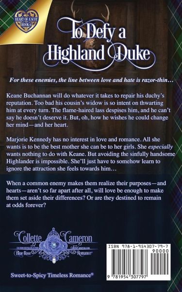 For these enemies, the line between love and hate is razor-thin... Keane Buchannan will do whatever it takes to repair his duchy's reputation. Too bad his cousin's widow is so intent on thwarting him at every turn. The flame-haired lass despises him, and he can't say he doesn't deserve it. But, oh, how he wishes he could change her mind-and her heart. Marjorie Kennedy has no interest in love and romance. All she wants is to be the best mother she can be to her girls. She especially wants nothing to do with Keane. But avoiding the sinfully handsome Highlander is impossible. She'll just have to somehow learn to ignore the attraction she feels towards him... When a common enemy makes them realize their purposes-and hearts-aren't so far apart after all, will love be enough to make them set aside their differences? Or are they destined to remain at odds forever? __________ This enthralling enemies to lovers Scottish historical by a USA Today bestselling author will have you guessing with bated breath what will happen to Keane and Marjorie next. Will they put aside their carefully laid plans and give love a chance? If you enjoy reading dukes, widows, and Highlander love stories brimming with mystery and suspense, a dash of humor, and gripping emotion, then you'll adore Collette Cameron's mesmerizing HEART OF A SCOT Series. Buy TO DEFY A HIGHLAND DUKE and settle into your favorite reading nook for a rousing Highland adventure you can't put down. Though this book can easily be read as a stand-alone, most readers prefer to read the series in order. HEART OF A SCOT SERIES: Book 1 - To Love a Highland Laird Book 2 - To Redeem a Highland Rogue Book 3 - To Seduce a Highland Scoundrel Book 4 - To Woo a Highland Warrior Book 5 - To Enchant a Highland Earl Book 6 - To Defy a Highland Duke Book 7 - To Marry a Highland Marauder Book 8 - To Bargain with a Highland Buccaneer Book 9 - A Christmas Kiss for the Highlander CHECK OUT COLLETTE'S OTHER SERIES: Daughters of Disgrace: Secrets of Scandalous Ladies Dukes Come Calling Heart of a Scot For the Love of an Earl (Wicked Earls' Club) Ladies of Opportunity The Culpepper Misses The Honorable Rogues®