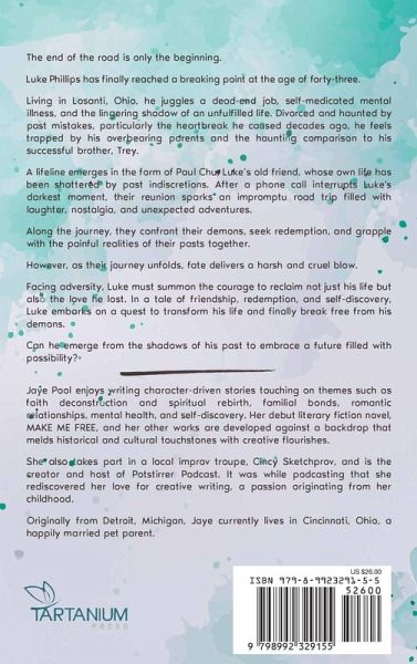 The end of the road is only the beginning. Luke Phillips has finally reached a breaking point at the age of forty-three. Living in Losanti, Ohio, he juggles a dead-end job, self-medicated mental illness, and the lingering shadow of an unfulfilled life. Divorced and haunted by past mistakes, particularly the heartbreak he caused decades ago, he feels trapped by his overbearing parents and the haunting comparison to his successful brother, Trey. A lifeline emerges in the form of Paul Chu, Luke's old friend, whose own life has been shattered by past indiscretions. After a phone call interrupts Luke's darkest moment, their reunion sparks an impromptu road trip filled with laughter, nostalgia, and unexpected adventures. Along the journey, they confront their demons, seek redemption, and grapple with the painful realities of their pasts together. However, as their adventure unfolds, fate delivers a harsh and cruel blow. Facing adversity, Luke must summon the courage to reclaim not just his life but also the love he lost. In a tale of friendship, redemption, and self-discovery, he embarks on a quest to transform his life and finally break free from his demons. Can Luke emerge from the shadows of his past to embrace a future filled with possibility?