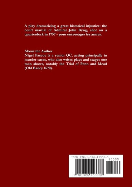 A play dramatizing a great historical injustice: the court martial of Admiral John Byng, shot on a quarterdeck in 1757 - pour encourager les autres. Nigel Pascoe is a senior QC, acting principally in murder cases, who also writes plays and stages one man shows, notably the Trial of Penn and Mead (Old Bailey 1670).