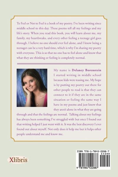 To Feel or Not to Feel is a book of my poetry. Ive been writing since middle school to this day. These poems tell all my feelings and my lifes story. When you read this book, you will learn about me, my family, my heartbreaks, and every other feeling a teenage girl goes through. I believe no one should ever feel alone, and I know being a teenager can be a very hard time, which is why Im sharing my poetry with everyone. This is so that no one has to feel alone and know that what they are thinking or feeling is completely normal.