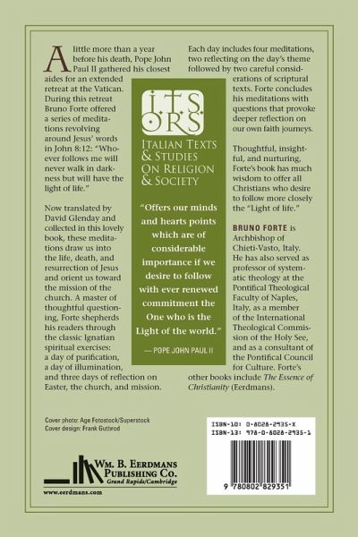 Foreword by Pope John Paul II Translated by David Glenday A little more than a year before his death, Pope John Paul II gathered his closest aides for an extended retreat at the Vatican. During this retreat Bruno Forte offered a series of meditations revolving around Jesus' words in John 8:12: "Whoever follows me will never walk in darkness but will have the light of life." Now translated by David Glenday and collected in this lovely book, these meditations draw us into the life, death, and resurrection of Jesus and orient us toward the mission of the church. A master of thoughtful questioning, Forte shepherds his readers through the classic Ignatian spiritual exercises: a day of purification, a day of illumination, and three days of reflection on Easter, the church, and mission. Each day includes four meditations, two reflecting on the day's theme followed by two careful considerations of scriptural texts. Forte concludes his meditations with questions that provoke deeper reflection on our own faith journeys. Thoughtful, insightful, and nurturing, Forte's book has much wisdom to offer all Christians who desire to follow more closely the "Light of life."