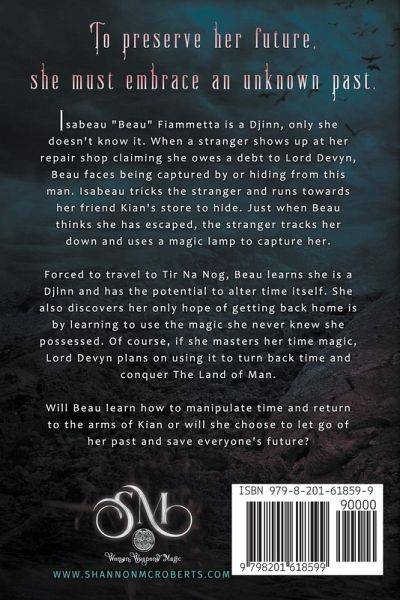 To preserve her future, she must embrace an unknown past Isabeau "Beau" Fiammetta is a Djinn, only she doesn't know it. When a stranger shows up at her repair shop claiming she owes a debt to Lord Devyn, Beau is faced with being captured by or hiding from this man. Isabeau tricks the stranger and runs towards her friend Kian's store to hide. Just when Beau thinks she has escaped, the stranger tracks her down and uses a magic lamp to capture her. Forced to travel to Tir Na Nog, Beau learns she is a Djinn and has the potential to alter time itself. She also discovers her only hope of getting back home is by learning to use the magic she never knew she possessed. Of course, if she masters her time magic, Lord Devyn plans on using it to turn back time and conquer The Land of Man. Will Beau learn how to manipulate time and return to the arms of Kian or will she choose to let go of her past and save everyone's future?