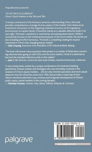 From village collectives in Southern China in the early 80s to the summer 1999 share rally, To Get Rich is Glorious provides a guide to twenty years of China's stock markets. The book analyses the changes that have occurred in all areas of China's securities business including legal, regulatory, share structure, issuers, investor base and market performance. Topics are placed in the context of the industry's overall development to highlight the market's current situation as China enters the new century.