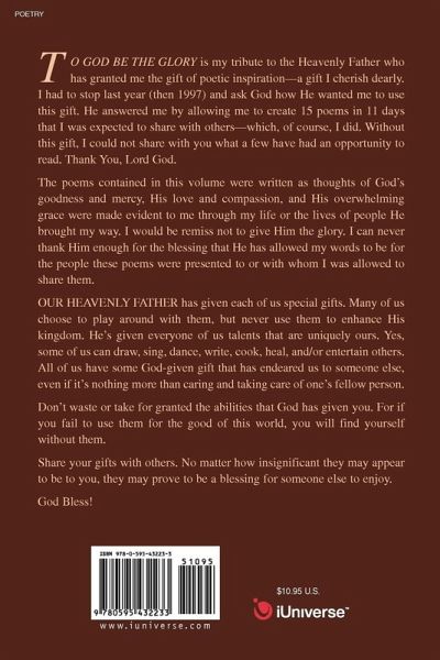 TO GOD BE THE GLORY is my tribute to the Heavenly Father who has granted me the gift of poetic inspiration-a gift I cherish dearly. I had to stop last year (then 1997) and ask God how He wanted me to use this gift. He answered me by allowing me to create 15 poems in 11 days that I was expected to share with others-which, of course, I did. Without this gift, I could not share with you what a few have had an opportunity to read. Thank You, Lord God. The poems contained in this volume were written as thoughts of God's goodness and mercy, His love and compassion, and His overwhelming grace were made evident to me through my life or the lives of people He brought my way. I would be remiss not to give Him the glory. I can never thank Him enough for the blessing that He has allowed my words to be for the people these poems were presented to or with whom I was allowed to share them. OUR HEAVENLY FATHER has given each of us special gifts. Many of us choose to play around with them, but never use them to enhance His kingdom. He's given everyone of us talents that are uniquely ours. Yes, some of us can draw, sing, dance, write, cook, heal, and/or entertain others. All of us have some God-given gift that has endeared us to someone else, even if it's nothing more than caring and taking care of one's fellow person. Don't waste or take for granted the abilities that God has given you. For if you fail to use them for the good of this world, you will find yourself without them. Share your gifts with others. No matter how insignificant they may appear to be to you, they may prove to be a blessing for someone else to enjoy. God Bless!