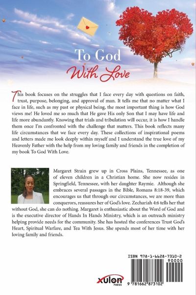 This book focuses on the struggles that I face every day with questions on faith, trust, purpose, belonging, and approval of man. It tells me that no matter what I face in life, such as my past or physical being, the most important thing is how God views me! He loved me so much that He gave His only Son that I may have life and life more abundantly. Knowing that trials and tribulation will occur, it is how I handle them once I'm confronted with the challenge that matters. This book reflects many life circumstances that we face every day. These collections of inspirational poems and letters made me look deeply within myself and I understand the true love of my Heavenly Father with the help from my loving family and friends in the completion of my book To God With Love. Margaret Strain grew up in Cross Plains, Tennessee, as one of eleven children in a Christian home. She now resides in Springfield, Tennessee, with her daughter Raymie. Although she embraces several passages in the Bible, Romans 8:18-39, which encourages us that through our circumstances, we are more than conquerors, reassures her of God's love. Zechariah 4:6 tells her that without God, she can do nothing. Margaret is enthusiastic about the Word of God and is the executive director of Hands In Hands Ministry, which is an outreach ministry helping provide needs for the community. She has hosted the conferences Trust God's Heart, Spiritual Warfare, and Tea With Jesus. She spends most of her time with her loving family and friends.