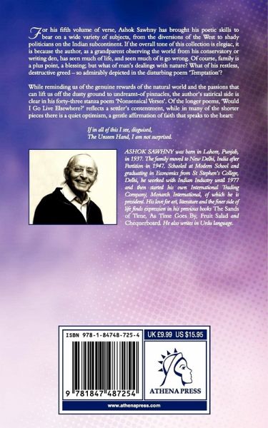 For his fifth volume of verse, Ashok Sawhny has brought his poetic skills to bear on a wide variety of subjects, from the diversions of the West to shady politicians on the Indian subcontinent. If the overall tone of this collection is elegiac, it is because the author, as a grandparent observing the world from his conservatory or writing den, has seen much of life, and seen much of it go wrong. Of course, family is a plus point, a blessing; but what of man's dealings with nature? What of his restless, destructive greed - so admirably depicted in the disturbing poem 'Temptation'? While reminding us of the genuine rewards of the natural world and the passions that can lift us off the dusty ground to undreamt-of pinnacles, the author's satirical side is clear in his forty-three stanza poem 'Nonsensical Verses'. Of the longer poems, 'Would I Go Live Elsewhere?' reflects a settler's contentment, while in many of the shorter pieces there is a quiet optimism, a gentle affirmation of faith that speaks to the heart: If in all of this I see, disguised, The Unseen Hand, I am not surprised. ASHOK SAWHNY was born in Lahore, Punjab, in 1937. The family moved to New Delhi, India after Partition in 1947. Schooled at Modern School and graduating in Economics from St Stephen's College, Delhi, he worked with Indian Industry until 1977 and then started his own International Trading Company, Monarch International, of which he is president. His love for art, literature and the finer side of life finds expression in his previous books The Sands of Time, As Time Goes By and Fruit Salad. He also writes in Urdu language.