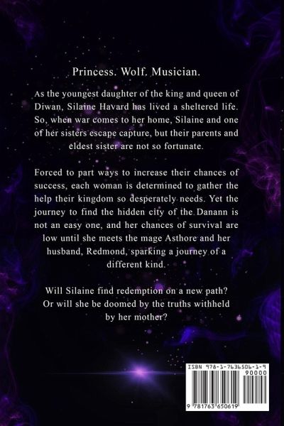 Princess. Wolf. Musician. As the youngest daughter of the king and queen of Diwan, Silaine Havard has lived a sheltered life. So, when war comes to her home, Silaine and one of her sisters escape capture, but their parents and eldest sister are not so fortunate. Forced to part ways to increase their chances of success, each woman is determined to gather the help their kingdom so desperately needs. Yet the journey to find the hidden city of the Danann is not an easy one, and her chances of survival are low until she meets the mage Asthore and her husband, Redmond, sparking a journey of a different kind. Will Silaine find redemption on a new path? Or will she be doomed by the truths withheld by her mother?