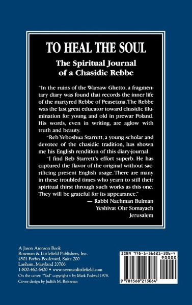 Within the vast and varied body of chasidic literature, rarely does one find a chasidic rebbe writing about himself. Those rebbes who did choose to put pen to paper tended to write expositions on biblical or rabbinical texts, and in many cases it was their students and followers who copied down their teachings. Thus the modern reader is left with works that tend to be impersonal, esoteric, and often complex. The journal of Rabbi Shapira is unique in its use of first-person narrative to relay the inner thoughts, fears, and struggles of this bold leader as he responds to the pains of life. It offers guidelines for spiritual progress and several meditations based on an active imagination. Rabbi Shapira tells us that the purpose of this work is to bequeath a journal of his personal struggles and triumphs to posterity. Some entries are indeed very revealing; the Rebbe is not afraid to disclose his moments of self-doubt, his anger, his fears, and his fervent hope that his soul will remain strong as his body grows old. The more one reads of Rabbi Shapira's journal, the more insight and inspiration one will glean from its message. Young and old will find personal, spiritual guidance in these pages and be able to reap from the maternal fulfillment.