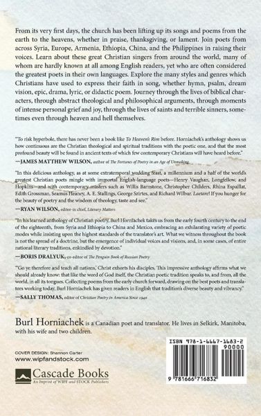 From its very first days, the church has been lifting up its songs and poems from the earth to the heavens, whether in praise, thanksgiving, or lament. Join poets from across Syria, Europe, Armenia, Ethiopia, China, and the Philippines in raising their voices. Learn about these great Christian singers from around the world, many of whom are hardly known at all among English readers, yet who are often considered the greatest poets in their own languages. Explore the many styles and genres which Christians have used to express their faith in song, whether hymn, psalm, dream vision, epic, drama, lyric, or didactic poem. Journey through the lives of biblical characters, through abstract theological and philosophical arguments, through moments of intense personal grief and joy, through the lives of saints and terrible sinners, sometimes even through heaven and hell themselves.