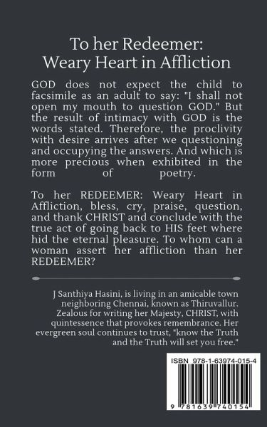 GOD does not expect the child to facsimile as an adult to say: "I shall not open my mouth to question GOD." But the result of the intimacy with GOD is the words stated. Therefore, the proclivity with desire arrives after we questioning and occupying the answers and experiences spiritually from the Holy one. And which is more precious when exhibited in the form of poetry. To her REDEEMER: Weary Heart in Affliction, bless, cry, praise, question, and thank CHRIST and conclude with the true act of going back to HIS feet where hid the eternal pleasure. To whom can a woman assert her affliction than her REDEEMER?